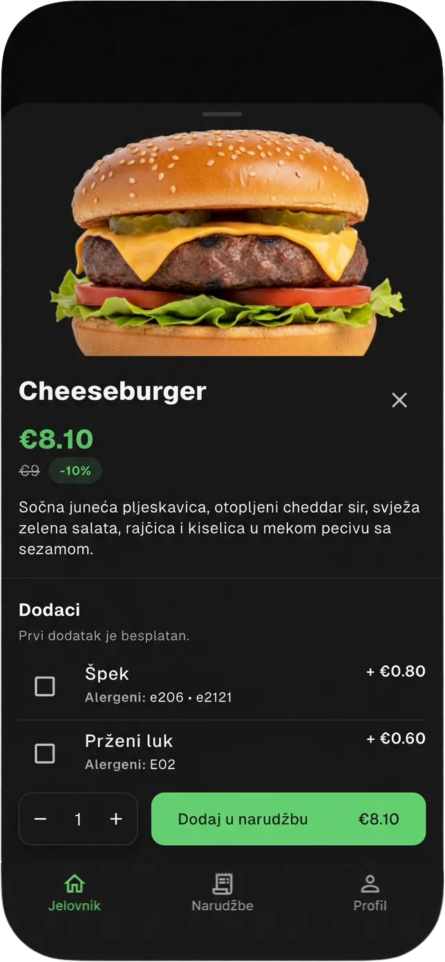 Dodaj što želiš, prilagodi priloge i potvrdi narudžbu. Mi odmah krećemo s pripremom.
