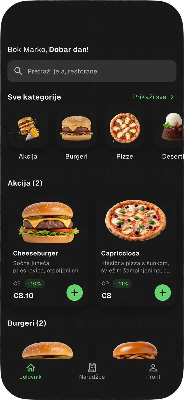 Složi svoju narudžbu dok hodaš prema nama. Bez poziva, bez čekanja u redu — samo par dodira na ekranu.